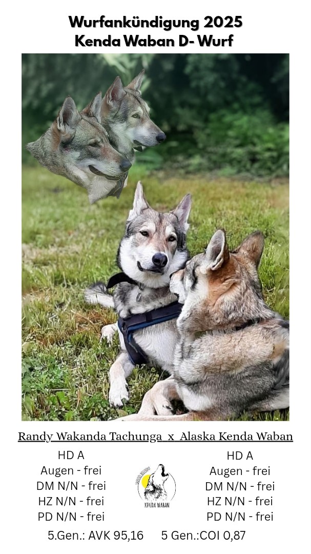 Züchter: Kenda Waban Aktueller Status: Wenige Welpen suchen noch einen Besitzer Wurftag: 07.08.2025 Alaska Kenda Waban Geburtsdatum: 01.12.2017 Standardtests: HD: A1 DM: (N/N) HZ: (N/N) Zuchtinfos: Wesen: sehr scheu Gebiss komplette Schere Randy Wakanda Tachunga Geburtsdatum: 05.06.2021 Standardtests: HD: A1 DM: Frei laut Abstammung HZ: Frei laut Abstammung Zuchtinfos: Wesen: offen und zutraulich Größe: 73cm Gebiss komplette Schere Weitere Fotos: Es wurden 4 Rüden und 2 Hündinnen geboren, alle wolfsgrau.